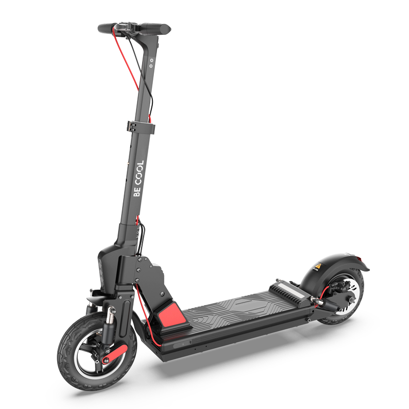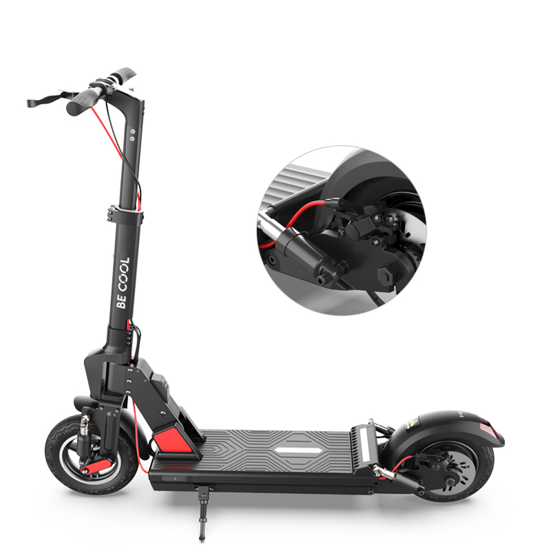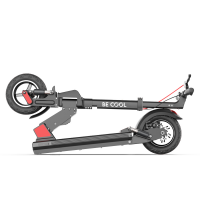 Der Rahmen des BE COOL eSC-P1 ist komplett aus hochwertigem Aluminium gefertigt. Das macht ihn besonders robust und langlebig. Ein weiteres Highlight des Models ist das sichere, duale Bremssystem. Die Kombination aus hocheffizienter Trommelbremse am Vorderrad und einer bewährten Scheibenbremse am Hinterrad erfüllt die höchsten Sicherheitsstandards.